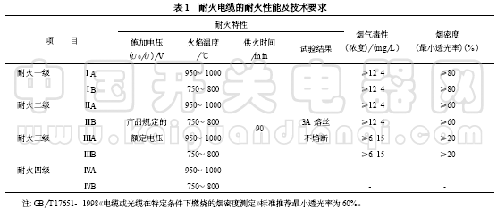 耐火电缆的耐火性能及技术要求根据GA 306-2001 标准, 主要特性见表1。